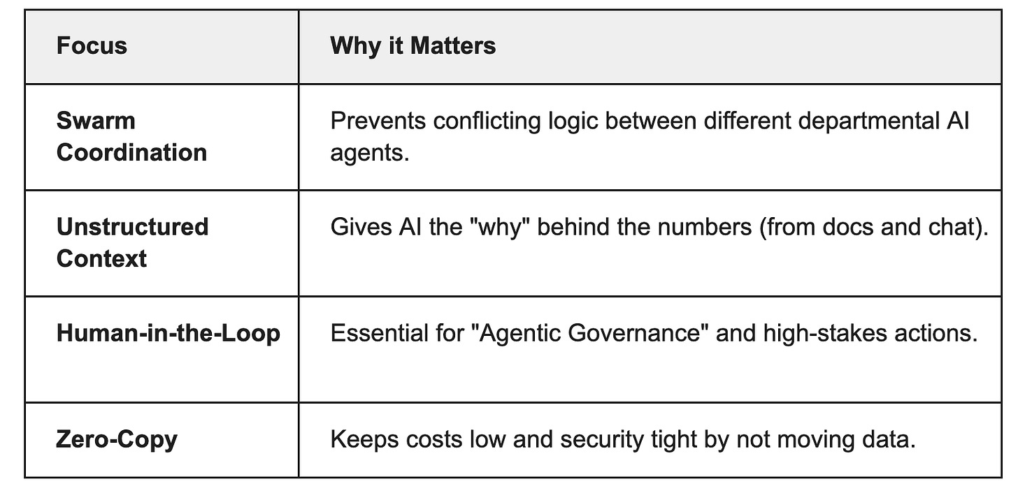 Zero-Copy Architectures: To avoid the “data shockwave” of spiraling storage costs and security risks, data stays in the warehouse. Zero-Copy tools bring the AI to the data, rather than moving sensitive info into third-party AI silos.