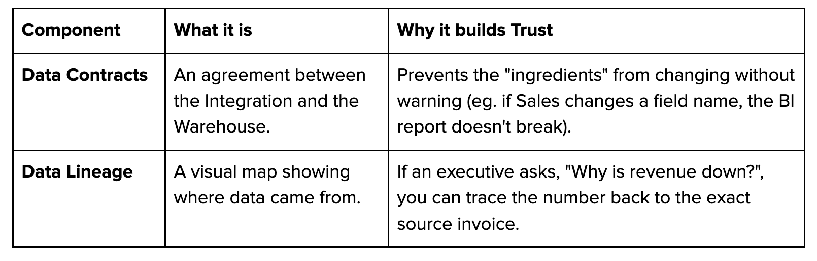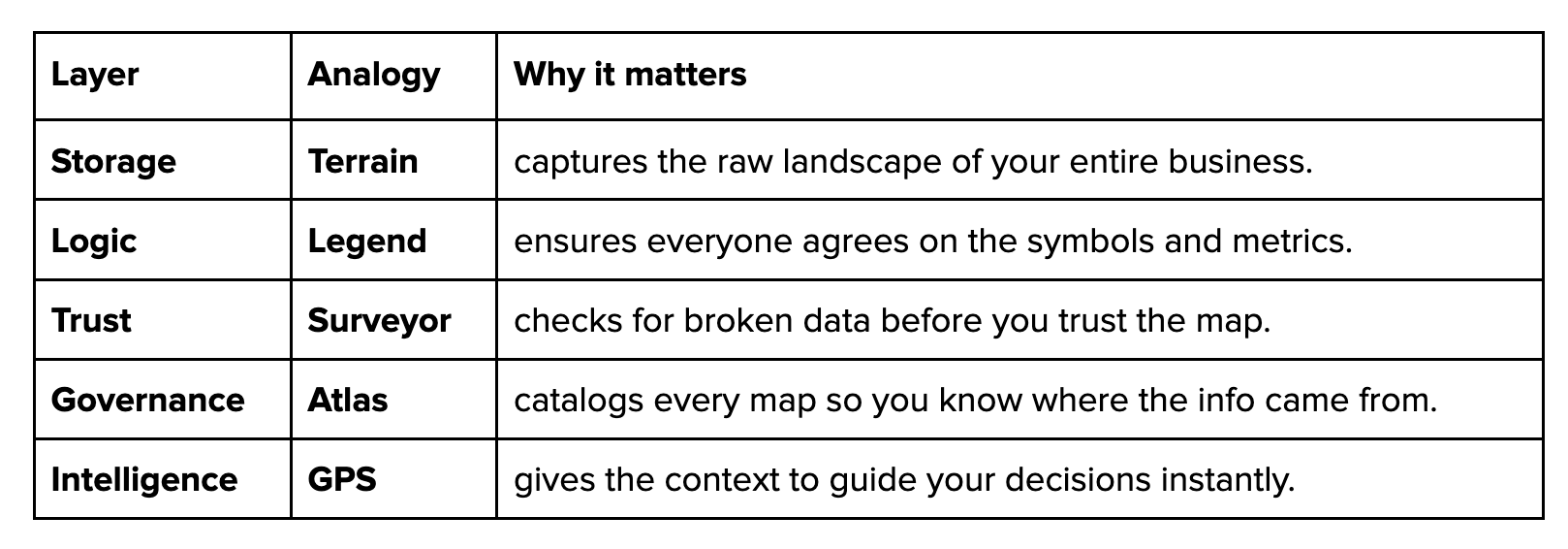 To ensure the map is readable, we have a Unified Semantic Layer and Master Data Management. Think of this as the “Map Legend”—it’s the single set of definitions that translates complex terrain into simple, agreed-upon terms.