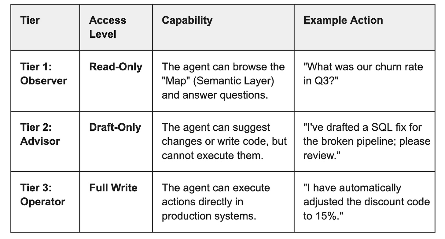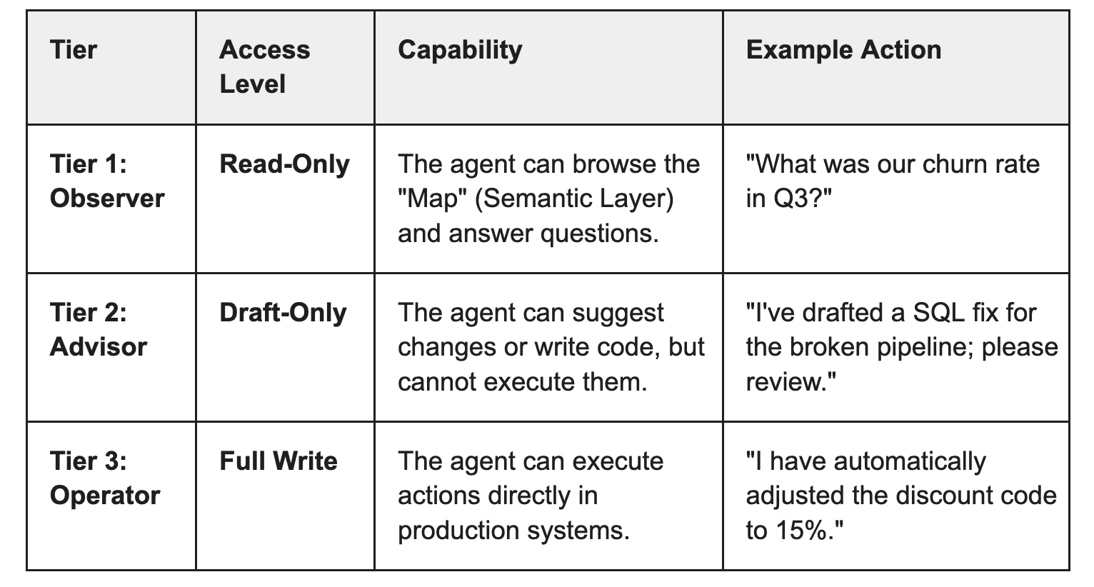 Kill Switch (Governance): Trust requires a safety valve. With Graduated Authority Models, agents can “Read” and “Analyze” freely, but require human-in-the-loop “Write” permissions for high-stakes actions like processing payments or adjusting prices.