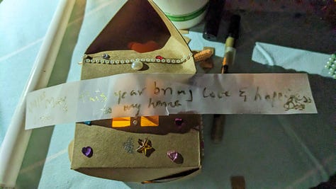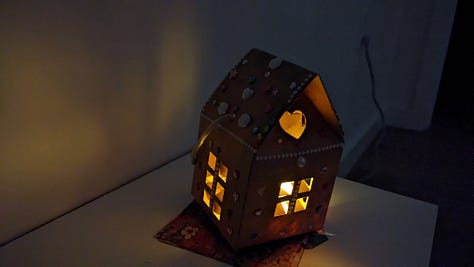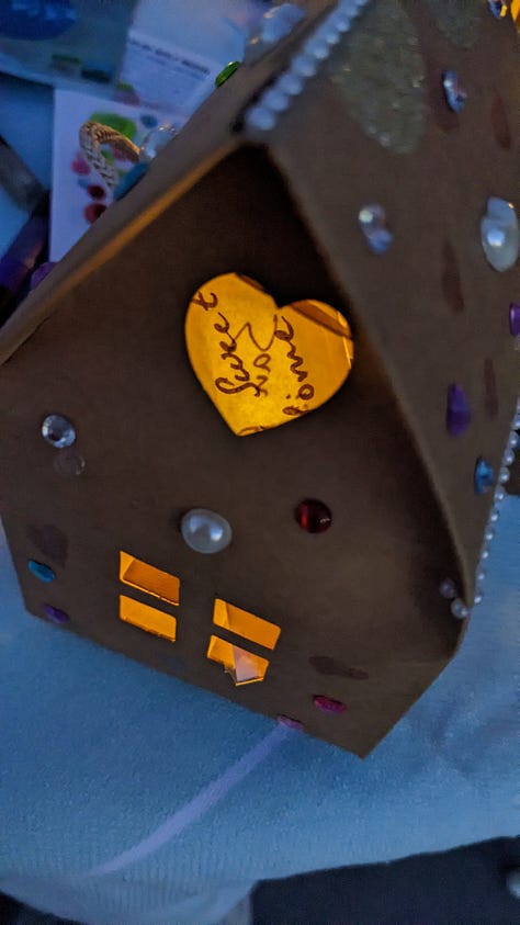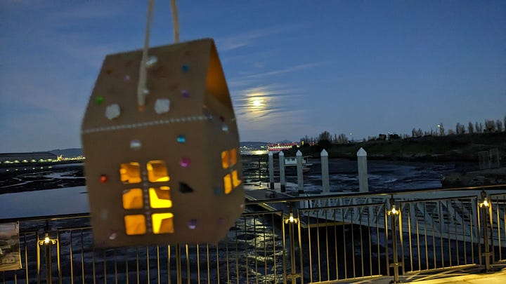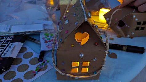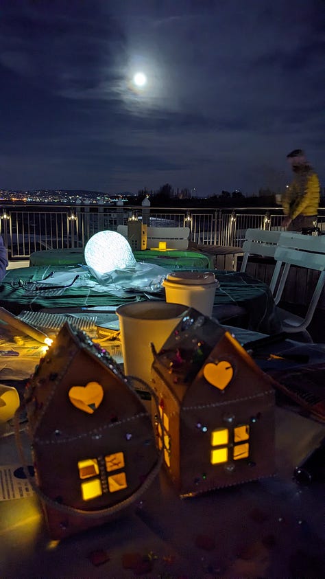 The full moon in January is the Wolf Moon. At first, we didn't know what to expect but we decided to show up anyway. And we celebrated as a community creating cozy home lanterns. Decorating our tiny homes and adding wishes of love and happiness.
