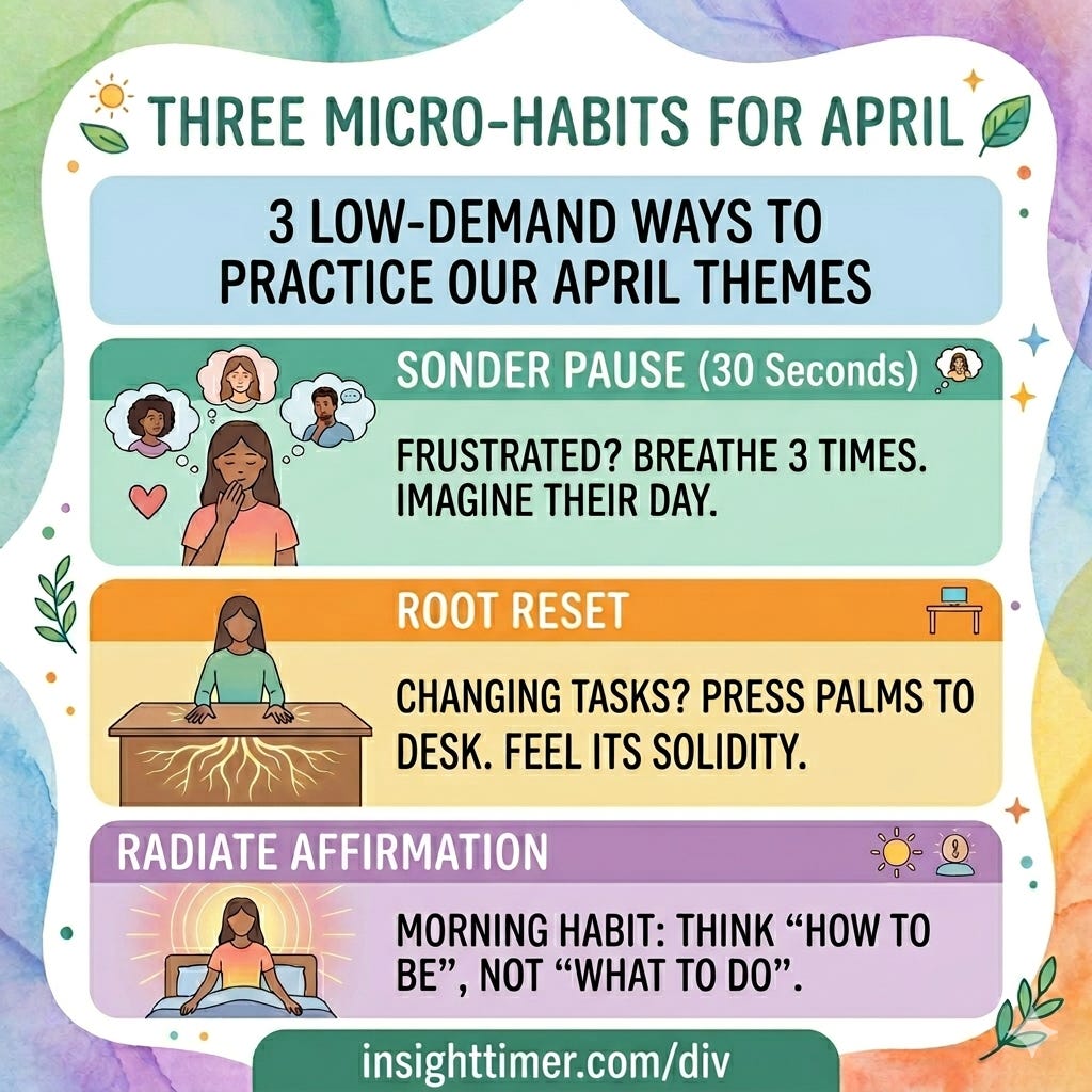 We don’t need to spend an hour a day meditating to find our center, if we cannot find the time to do so. Here are three “low-demand” ways to practice our April themes: