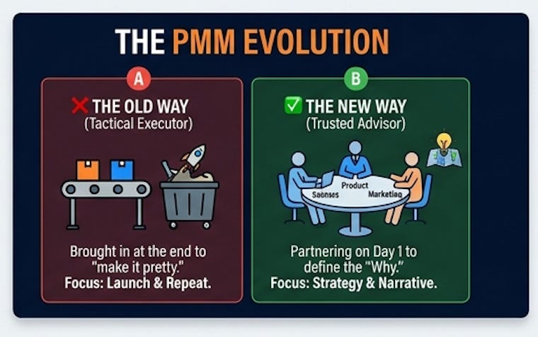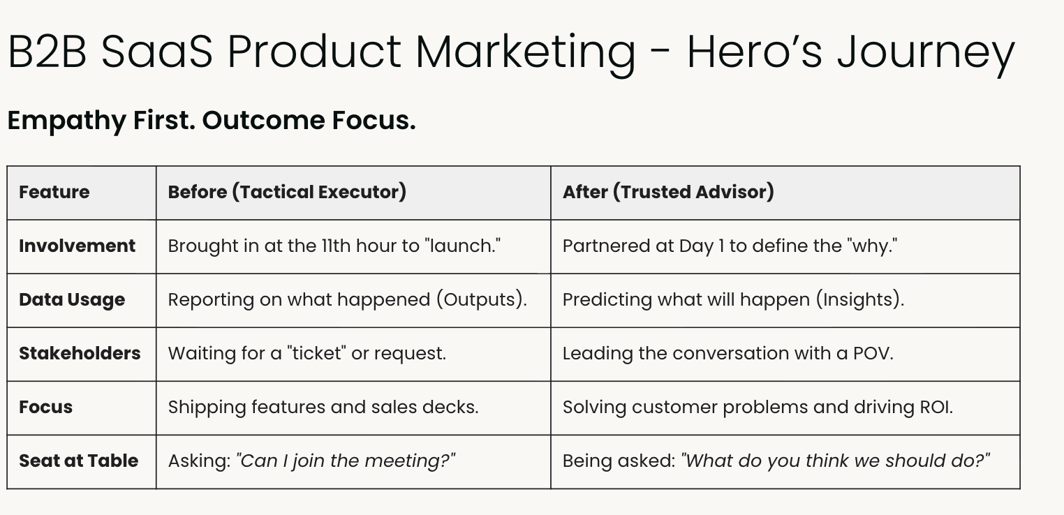 In our fast-paced world of B2B SaaS, it’s easy to get caught up in the “launch and repeat” cycle. We often find ourselves checking off boxes instead of checking in with our market and customer. But there is a higher level in product marketing for us: moving from a tactical executor to a Trusted Advisor.