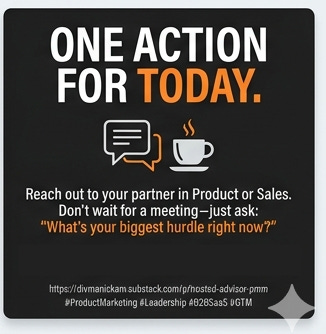 Connect the Dots: Reach out to one person in Product, Marketing and Sales to understand their biggest hurdle in closing deals right now.